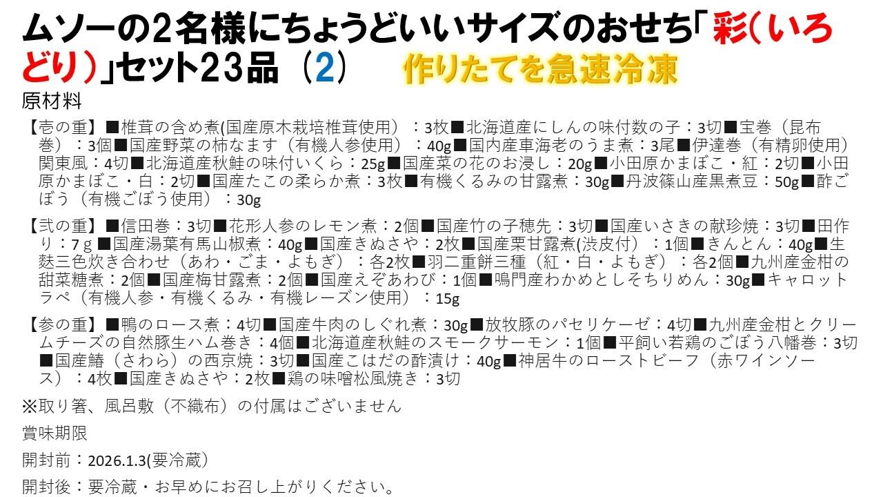 早割おせち『彩 いろどり ムソー冷凍』セット23品(約2人前)【冷凍直送、折詰入】★12月29日30日選択可能お届け【全国一律送料無料】★予約販売12/5 14時まで★
